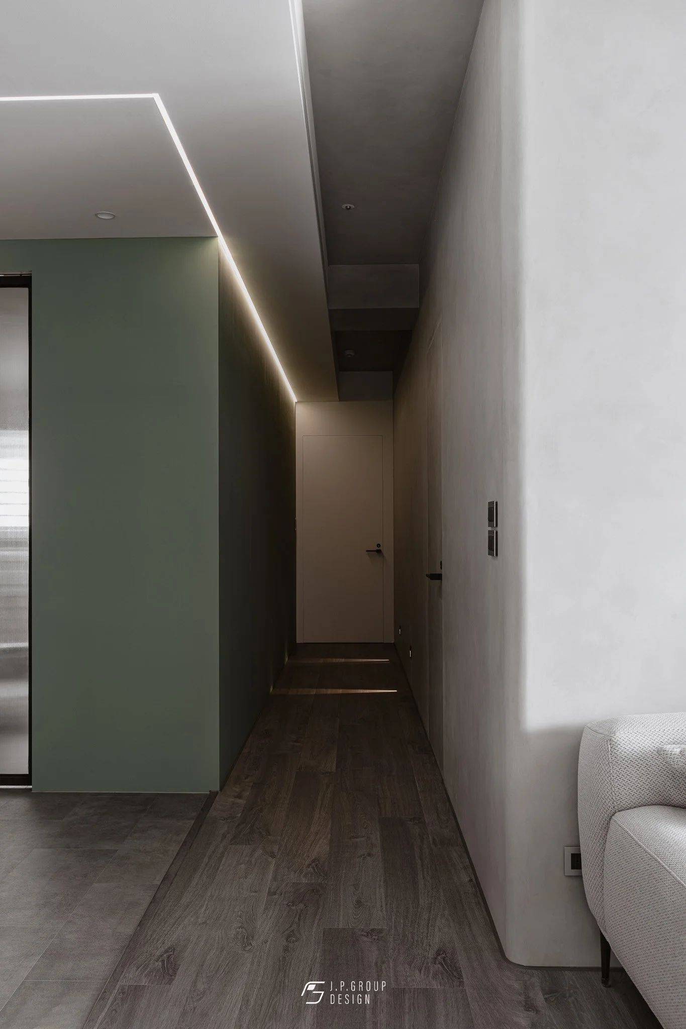 入門口處仿清水模磁磚的地坪和客廳區域的超耐磨木地板清晰地劃分出空間的主從關係,增添了整體空間的條理性和辨識度。客廳區域採用一字型沙發搭配貫穿整片落地窗的臥榻,為空間的使用帶來多樣性,並滿足屋主常常邀請朋友來作客的人數需求。此外,合理設置的少量收納櫃體既滿足了必要的功能,也為空間帶來了更舒適的尺度。