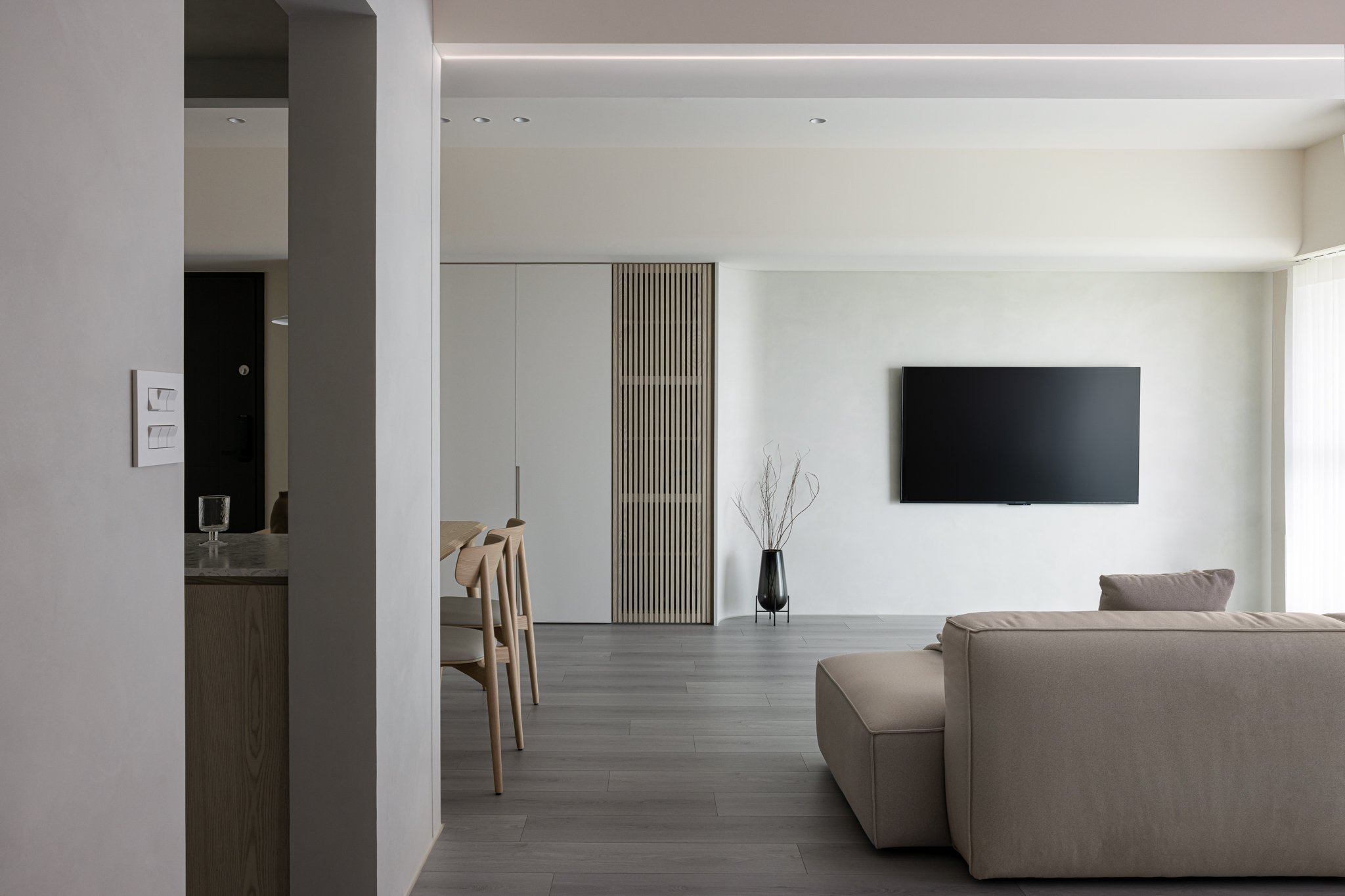 清晨的光從窗簾縫間滲進屋內,推開門的那一刻,室內沒有喧嘩、沒有多餘裝飾,只有安靜的線條與柔和的色溫。視線在木質與灰白之間游移,空氣像是被整理過一般,節奏緩慢而清晰…